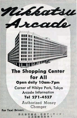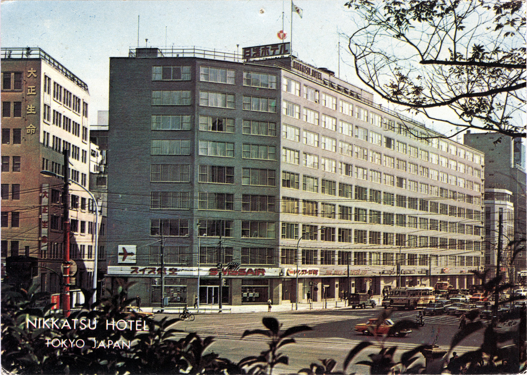 Nikkatsu Hotel, Tokyo, c. 1965. The first modern office building built in Tokyo after World War II, the Nikkatsu International Building was completed in 1952 just as the Occupation of Japan was ending. Occupying the four top floors of the building was the 133-room Nikkatsu Hotel, at that time the only serious rival to the Imperial Hotel in terms of luxurious accommodations and convenience. The buildings International Arcade included airline ticketing offices (including both Pan American Airways and Northwest Orient Airlines), a host of duty-free shops selling cameras and electronics, and the American Pharmacy.
