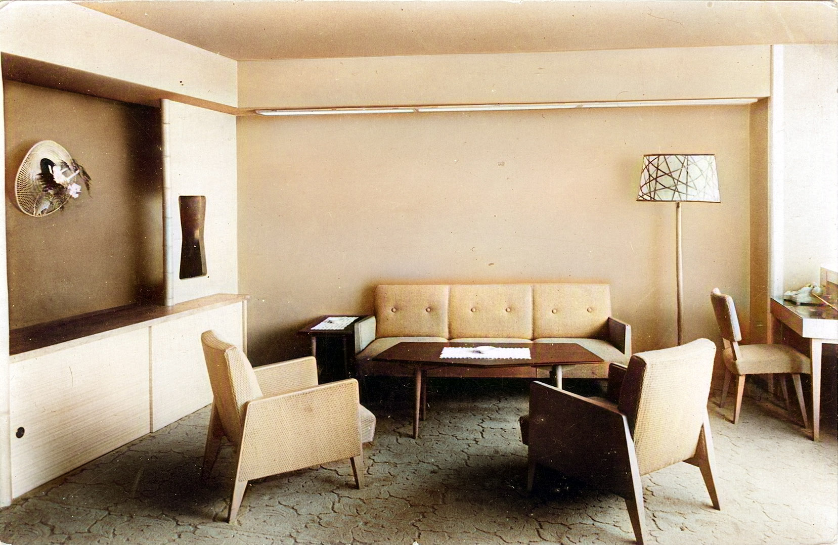 Nikkatsu Hotel suite, c. 1960. (Colorized) The trapezoidal shape of the building resulted in some rather unusual room layouts on the north end.