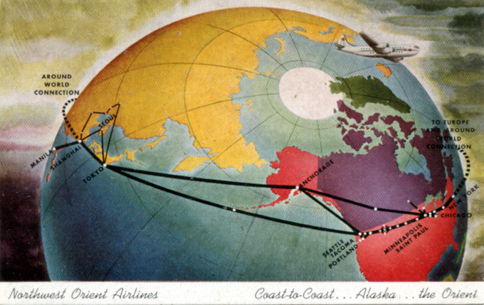 Promotional postcard depicting Northwest Orient Airlines’ North Pacific (“Great Circle”) routes map, c. 1949, prior to the removal of Shanghai, China, from its routes in May, 1949 at the aftermath of the Chinese civil war, and NWA’s acquisition of the “Stratocruiser” in June, 1949. In 1931, Northwest sponsored Charles and Anne Morrow Lindbergh on a pioneering test flight to Japan via Alaska, scouting what would become known as the Northwest Airlines’ Great Circle route – one that could save as many as 2,000 miles (3,000 km) on a New York City to Tokyo flight.