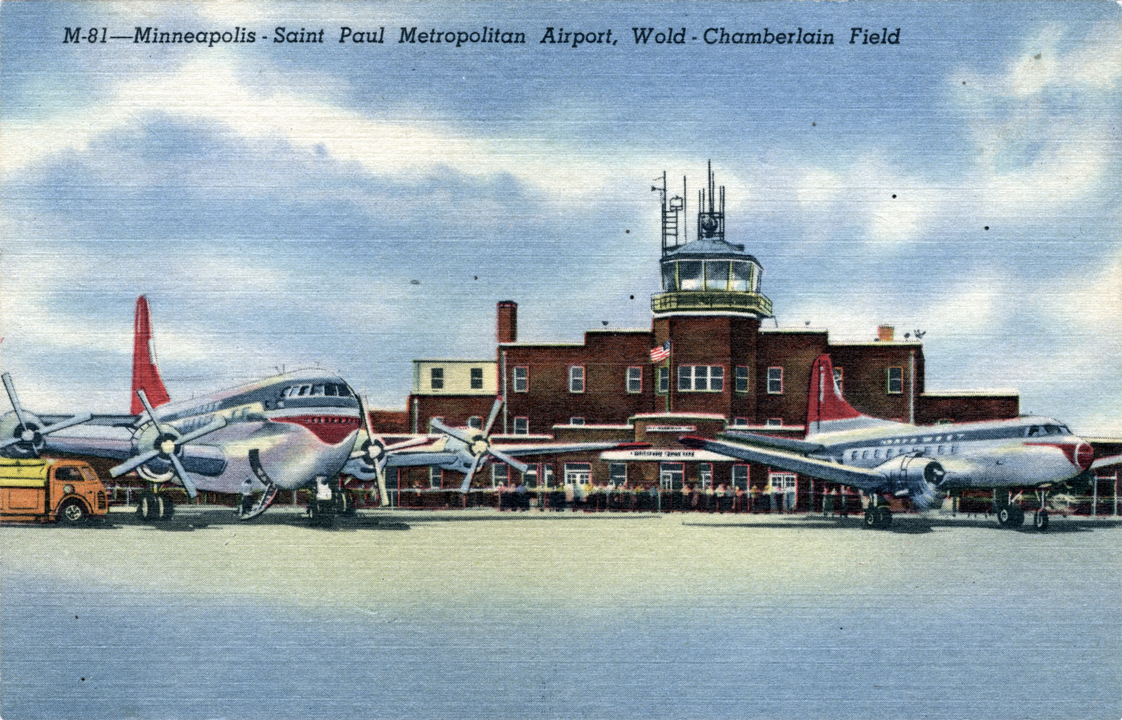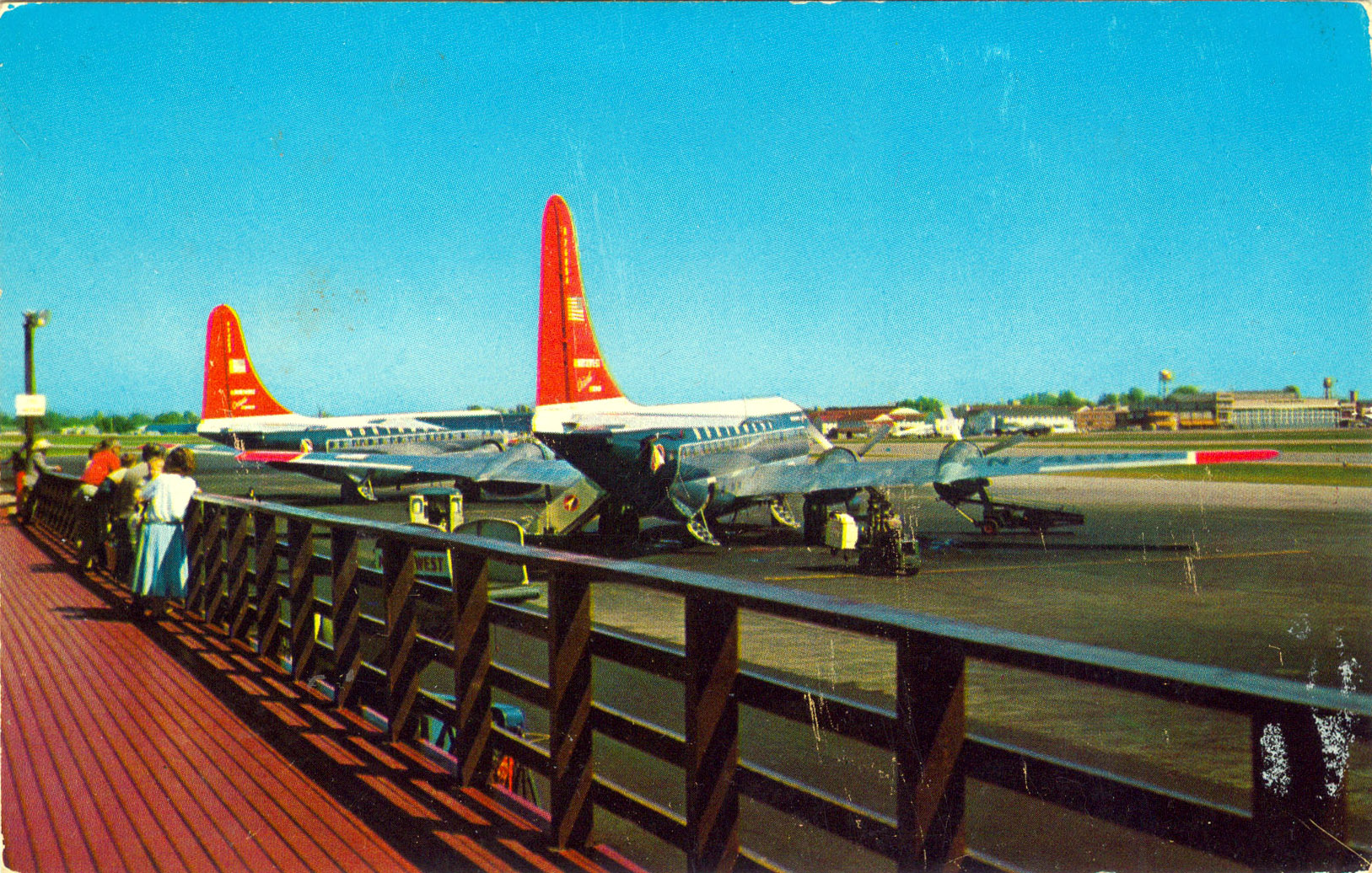 Minneapolis-St. Paul Wold-Chamberlain Field, c. 1949, depicting a NWA B-377 “Stratocruiser” (left) and DC-4 (right) in the “red tail” livery.