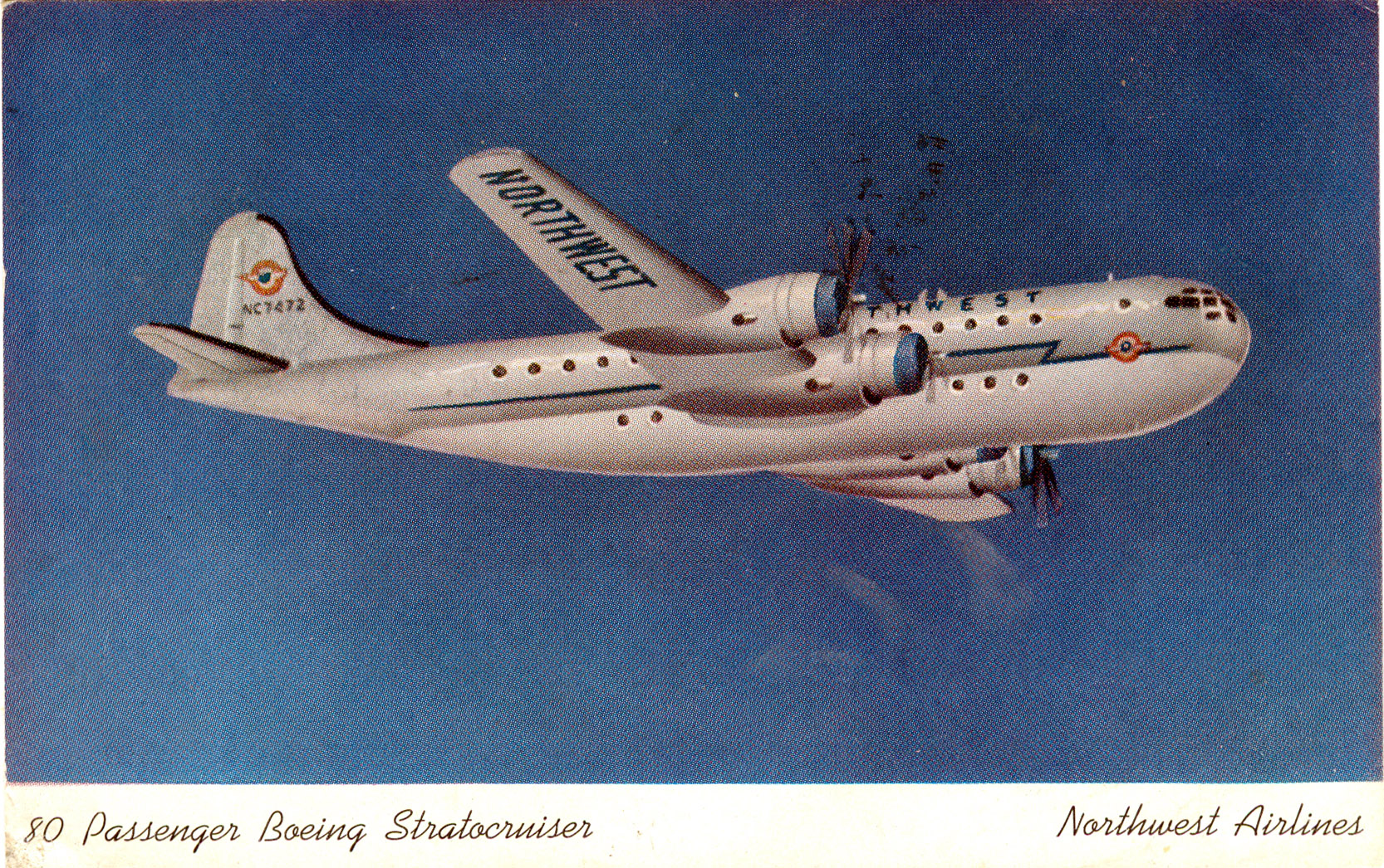 Pre-acquisition promotional postcard for the Northwest Airlines B-377 “Stratocruiser” (NC-7472), c. 1948, before the airline’s adoption of the “Orient” and “red tail” livery in 1949.