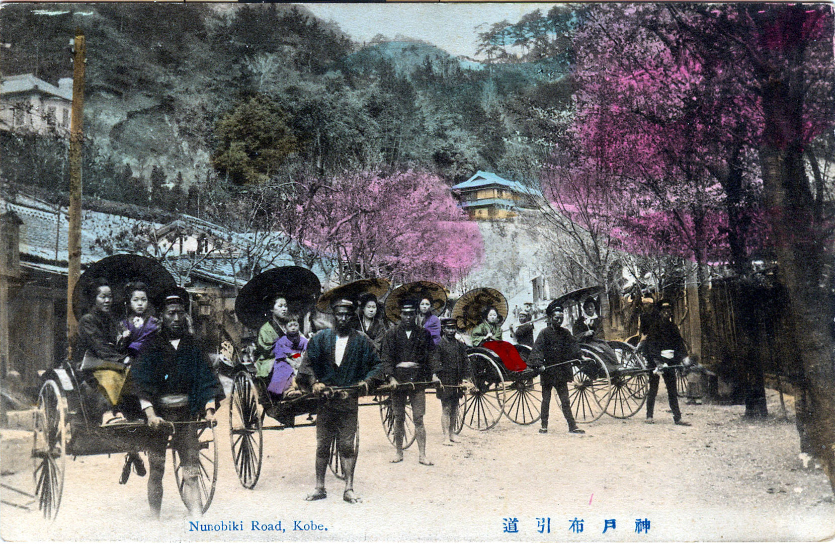 “Large monkeys are occasionally seen in the neighbourhood. Ladies are advised to visit Nunobiki under the escort of gentlemen, as the tea-houses are apt to be noisy. A good view of Kobe and the surrounding country may be had from Sunago-yama, a detached hill near the fall. There is a tea-house at the top.”