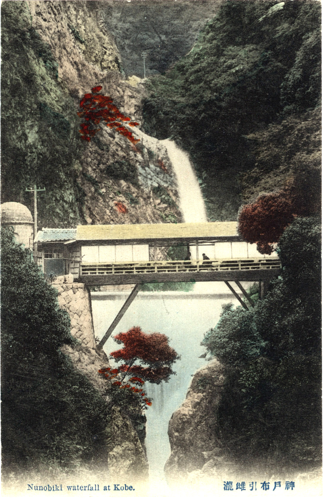 “The Nunobiki Waterfalls are about 20 min. from the Kobe foreign settlement. The path first reaches the Men-daki, or ‘Female Falls,’ 43 ft. high; then passing through a tea-house and under a covered bridge, it climbs to other tea-houses commanding a view of the upper, or ‘Male Fall’ (On-daki), 82 ft. high. Paths lead down to the bottom of each fall, and it is possible to bathe at certain hours of the morning.