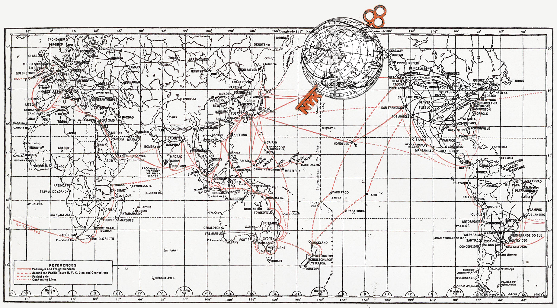 Map: NYK worldwide passenger and freighter shipping routes, and connecting lines, 1927.