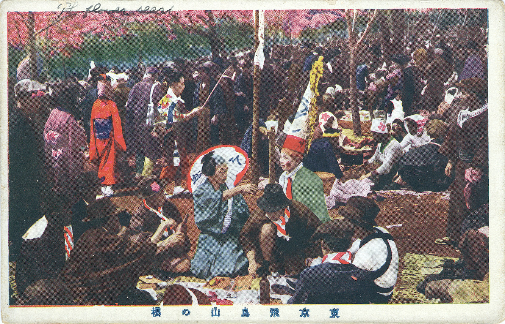 O-hanami gathering of a chindonya troupe (foreground) beneath the cherry blossoms at Asukayama, Tokyo, c. 1910. Chindonya were elaborately-costumed street musicians and touts who advertised for shops, restaurants, and other establishments, seen here taking a break from the rigors of street performances by celebrating the season’s hanami picnic-style under the blossoms.