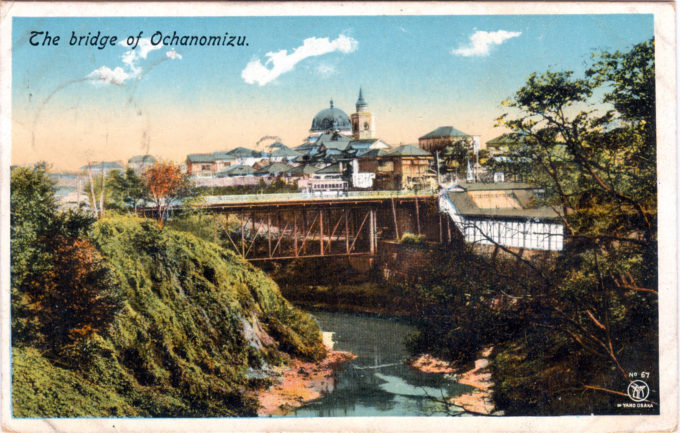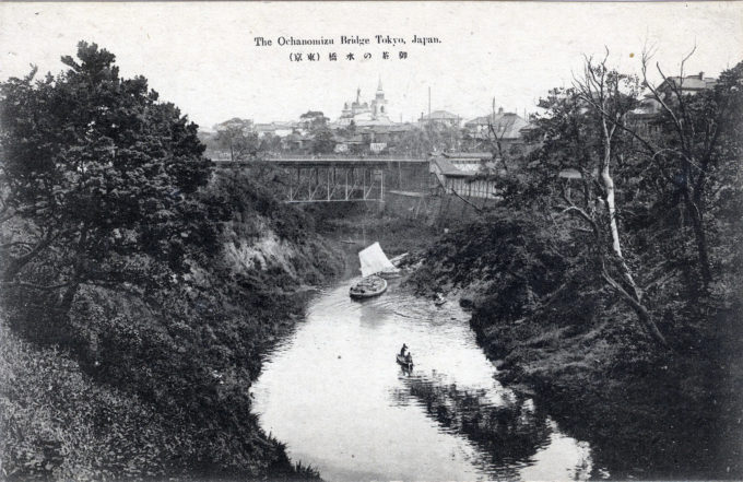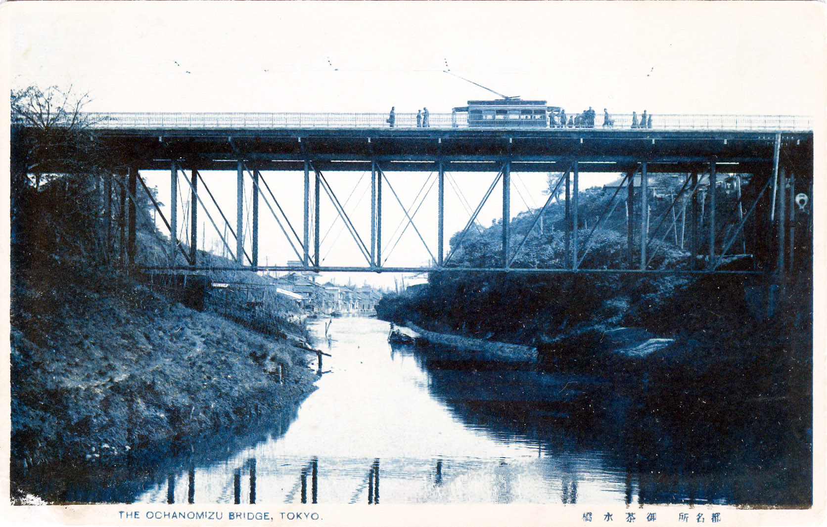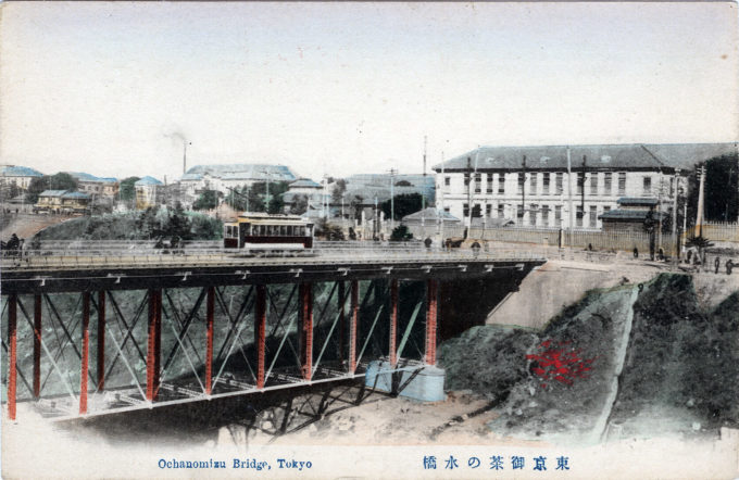 “One of the finest and best-built bridges in the metropolis is that known as Ochanomizu-bashi, a beautiful and lofty iron arch which spans the canal running between Hongo and Kanda, and connects the two districts by a broad roadway from the top of Surugadai. This used, forty or fifty years ago [i.e., pre-Meiji ca. 1860], to be one of the most noted places in Tokyo, as it is still one of the most picturesque.