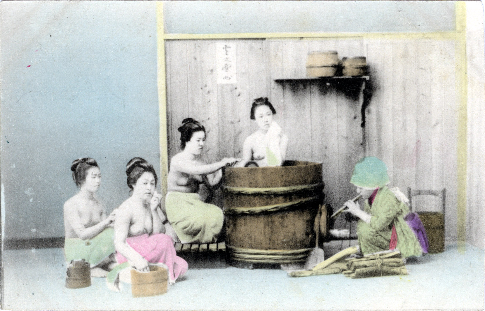 “Both sexes are very partial to bathing, and consequently public baths are numerous. In large towns they may be counted by hundreds. Until lately, men and women, boys and girls, bathed together indiscriminately. But now, in Tokio and other large towns, a railing divides the males from the females. This is only sufficient to prevent the mixing of the sexes, but not to screen them from being seen by each other. The hot water is contained in oblong wooden vats, 8 to 10 feet in length, 3 or 4 feet wide and 3-1/2 feet deep. These are heated from behind, by burning wood in large brass cylinders, the closed end of which communicates with the water.