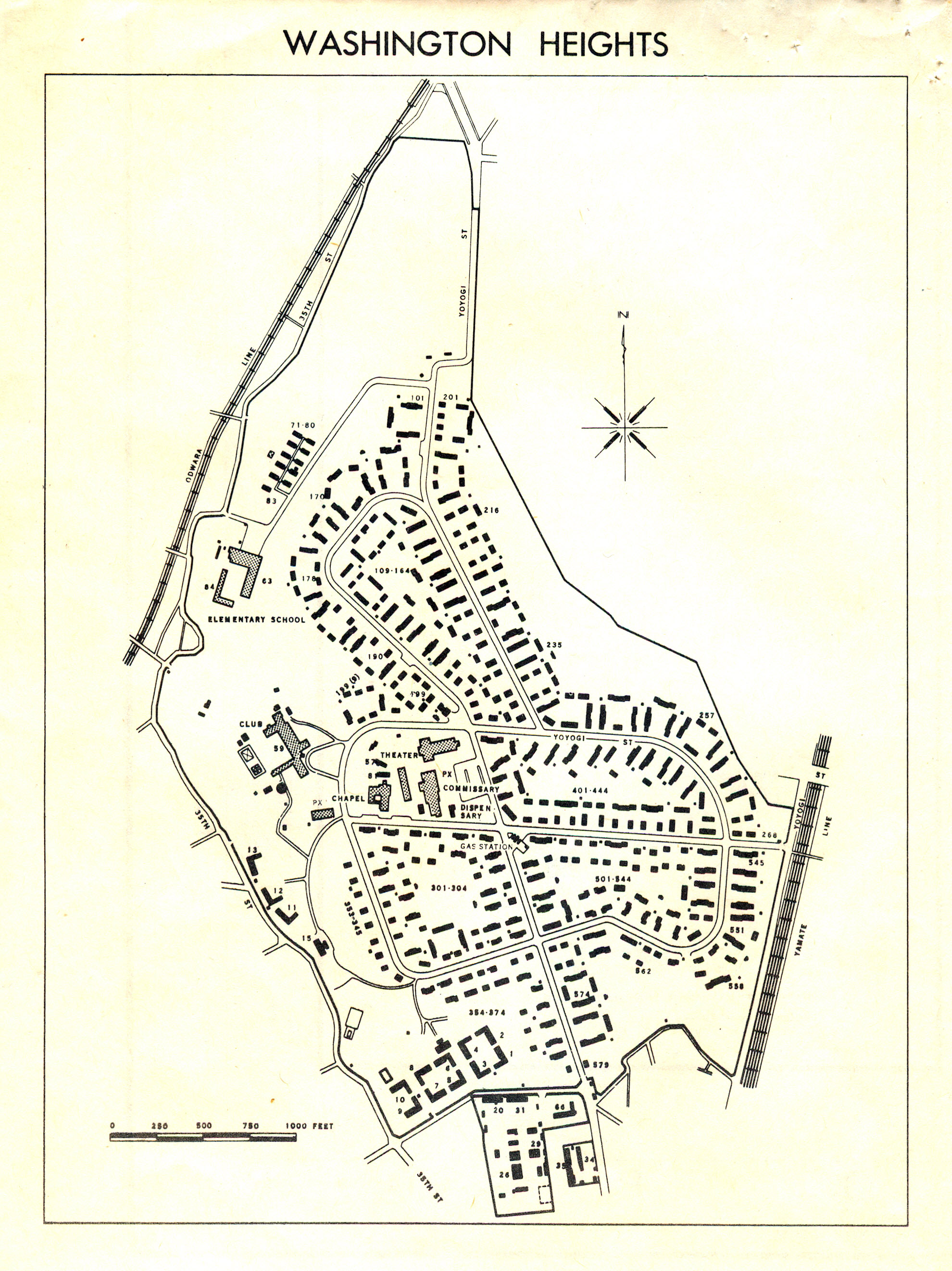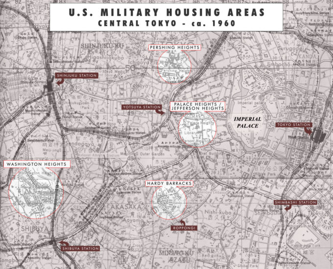 “Covering an area of 924,000 square meters, Washington Heights was home to 827 housing units for United States Army Air Force and, later, Air Force families. It also hosted support facilities, including schools, churches, theaters, shops, and officers’ clubs. Japanese citizens were not permitted to enter the area, which was fenced in with multiple gates.