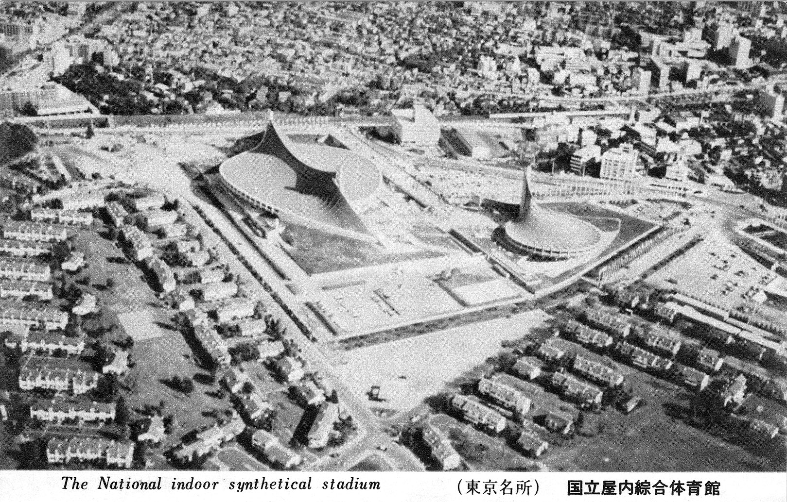 Aerial view of the Olympic stadiums at Yoyogi, with the remaining Washington Heights housing (foreground) used as athlete’s dormitories, 1964.