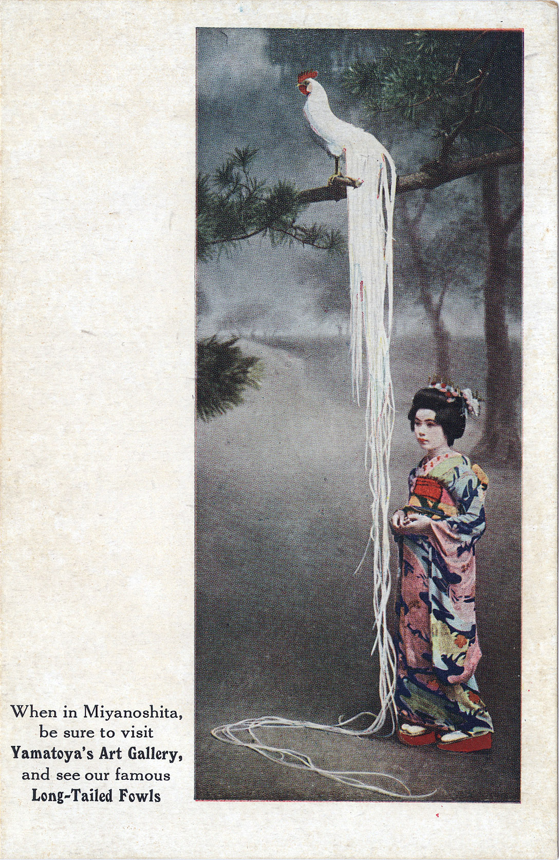 “When in Miyanoshita, be sure to visit Yamatoya’s Art Gallery, and see our famous Long-Tailed Fowls”, Miyanoshita, Japan, c. 1920. Yamatoya Art Gallery is long-established store of antique art founded at Miyanoshita, near Hakone, during the Meiji era (ca. 1900). Since its founding, it has been a specialty store for old ceramics, lacquerware and ukiyo-e.