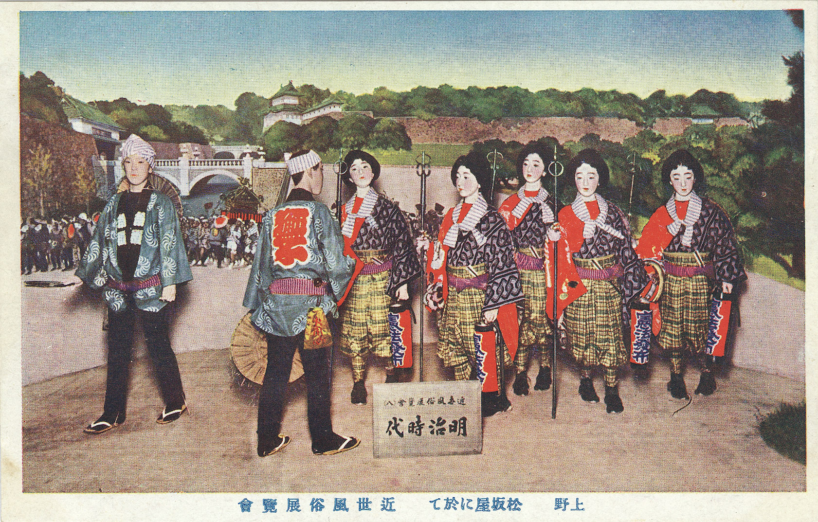 In the background is a Mitsukoshi-Nihonbashi department store in-store diorama of the Imperial Palace, c. 1930, commemorating the 1889 (Meiji 22) promulgation of the Meiji Constitution. In the foreground, to the right, are store mannequins dressed as Onna-bugeisha – feudal-era castle guards – holding naginata. To the left are a mannequin “family” as they might be formally dressed circa 1889.