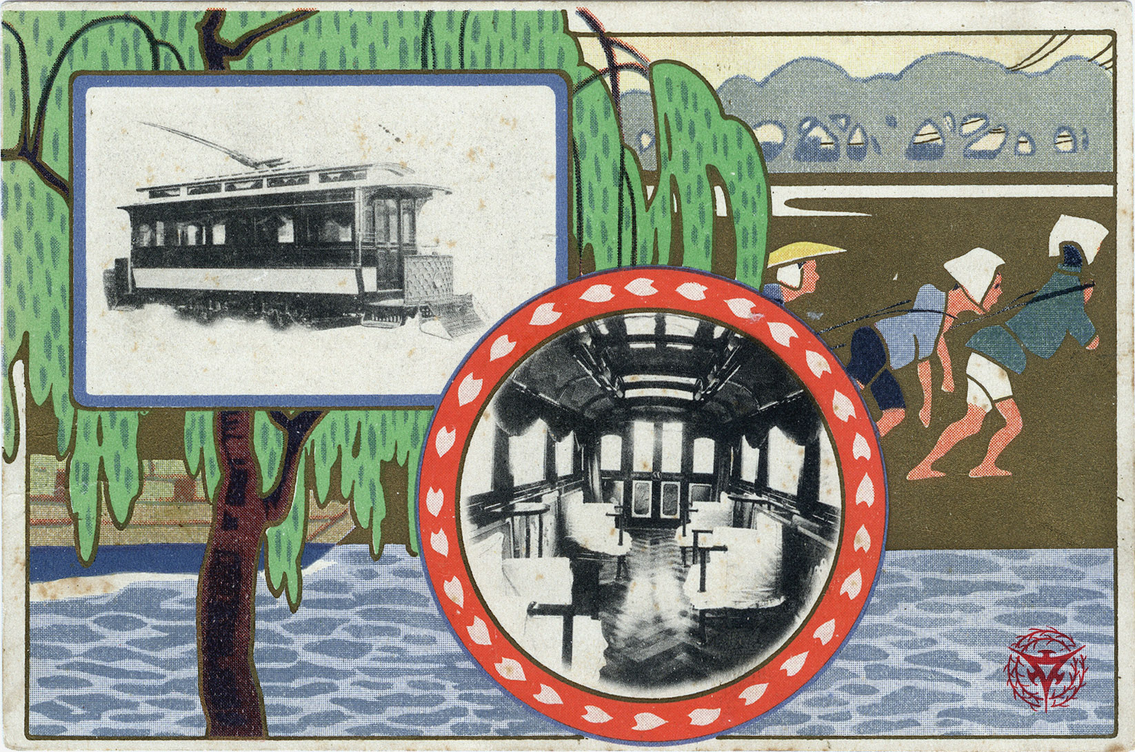 Opening of the Kyoto electric streetcar system (1895) commemorative postcard, c. 1905. Kyoto Electric Railway began operations in 1895, Japan’s first electric streetcar system, utilizing hydroelectric power generated by the Lake Biwa Canal. Center inset photo shows a tram carriage interior.