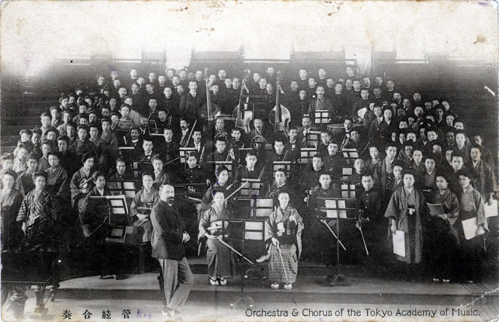 Orchestra & Chorus, Tokyo Academy of Music, c. 1910. Professor August Junker, Director. Founded as a government school in 1877 as the “Institute of Music”, the Institute took the name “Academy of Music” in 1887. Its curriculum was focused primarily on teacher education.