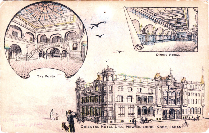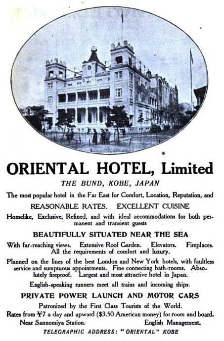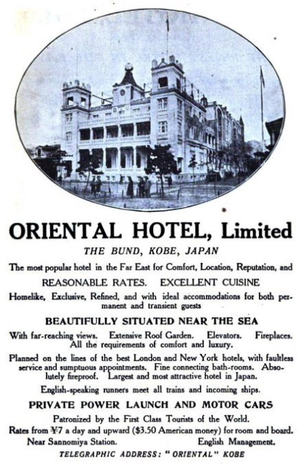 “There are other hotels – of sorts – in Kobe, but the Oriental so far out-distances them in respect to locality, rates, comfort, and general convenience that tourists and business men, on arriving at the station or landing stage, usually say to a ‘rikisha man, ‘HOTEL!’ The direction has but one meaning throughout Kobe.