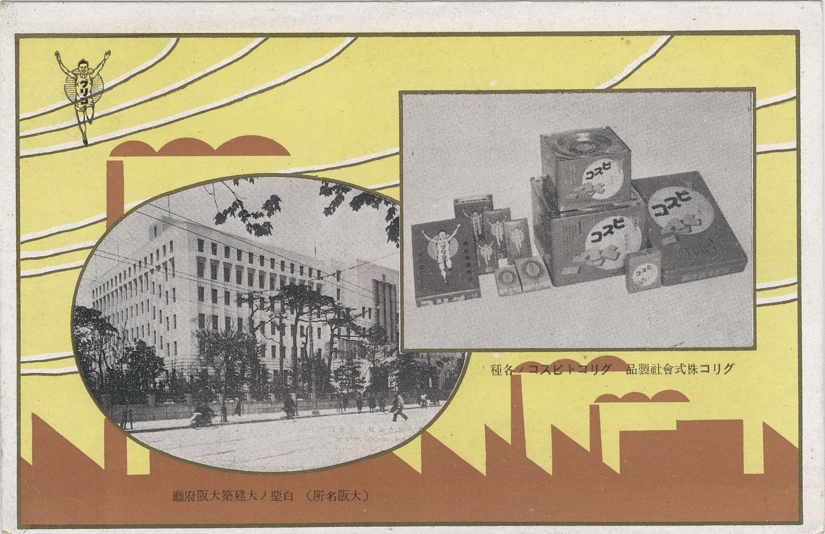 Osaka home office of the Glico Confectionery Co. advertising postcard, c. 1935. Best known today for its Pocky chocolate-covered biscuit pretzel sticks, the confectionery company’s first products were ‘Glico’ caramel, introduced in 1922 and still selling today, and Glico Bisuko [a transliteration of ‘biscuit’], a biscuit cookie, in 1933.