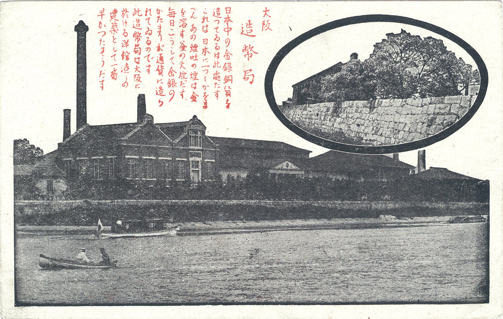 Osaka Mint, Osaka, c. 1920. The establishment of an Imperial Mint was one of the first acts of the Meiji government, and the Osaka Mint opened in April, 1871 as the means to mint coins by modern methods. The brick buildings seen in the postcard image replaced the original Mint in 1911, and the grounds were landscaped with more than 300 cherry trees.