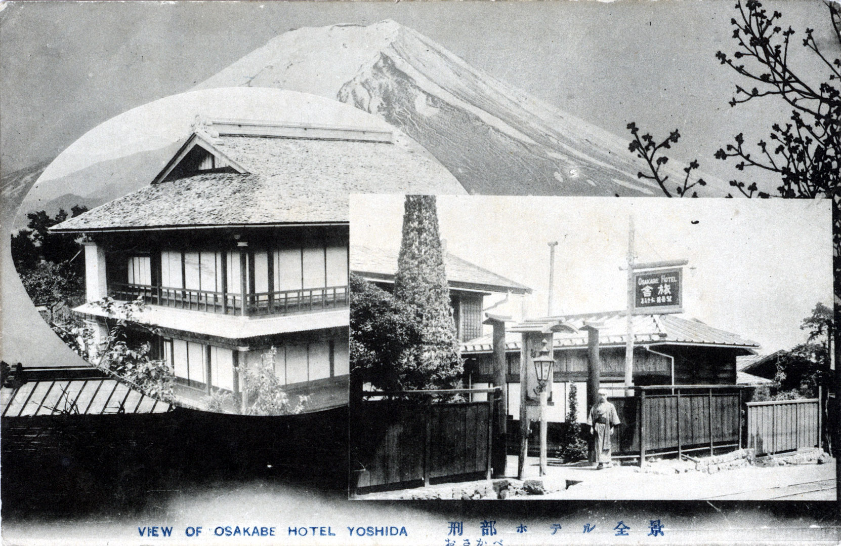 “View of Osakabe Hotel, Yoshida,” c. 1910. The Yoshida trail up Mt. Fuji at Fujiyoshida is still today a popular route for ascending Japan’s most mystical mountain, partially seen in the image.
