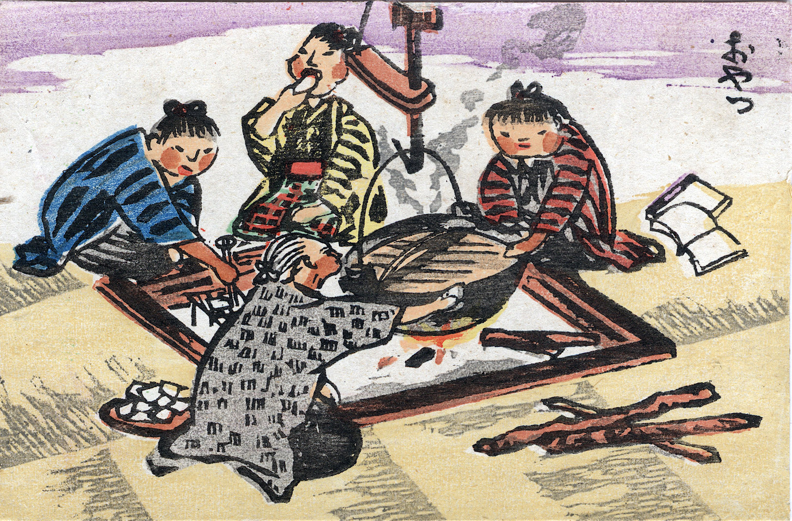 “Oyatsu” [Afternoon refreshment], c. 1950. A stew kettle hangs over the irori (“hearth”), with grilled mochi (or onigiri?) also being prepared. Unknown woodblock artist. From a small series of woodblock print postcards produced during the Occupation for sale to Allied troops and postwar tourists.