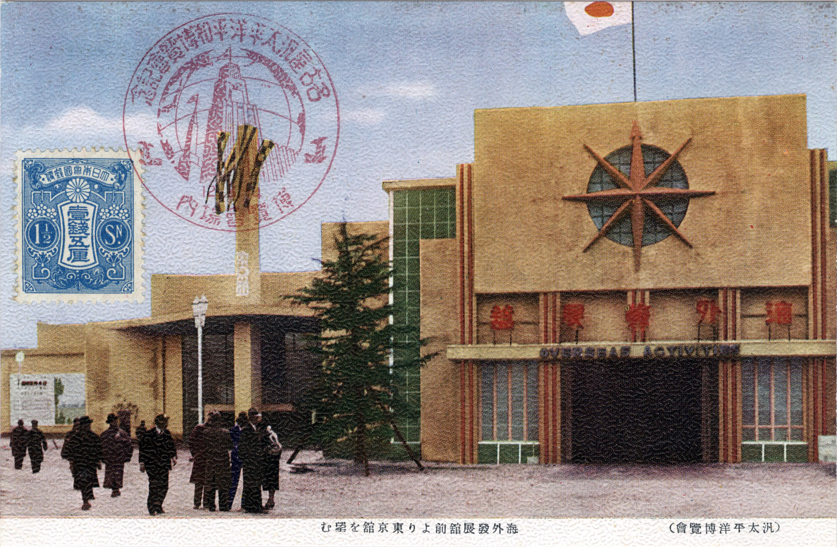 Overseas Activities Pavilion, Nagoya Pan-Pacific Peace Exposition, 1937. With commemorative postmark.