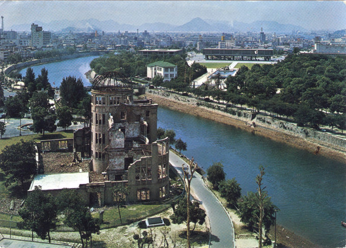 A panoramic view of Peace Memorial Park, Hiroshima, c. 1960, including the “Atomic Bomb Dome”, the former Hiroshima Prefectural Industrial Promotion Hall completed in 1915.