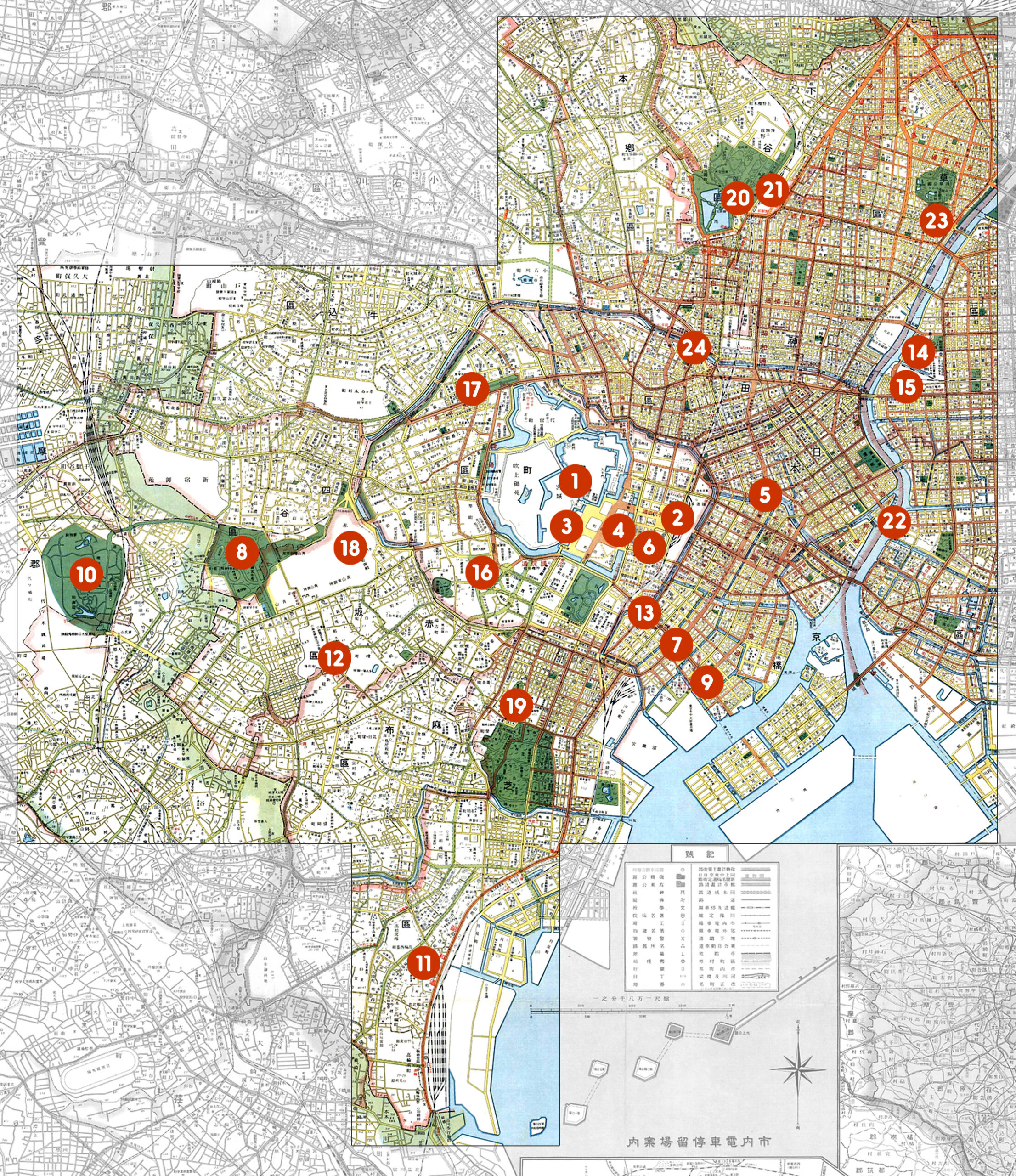 Map (above): Tokyo Motorbus Co. “Yellow Bus” tour destination locations, c. 1940,