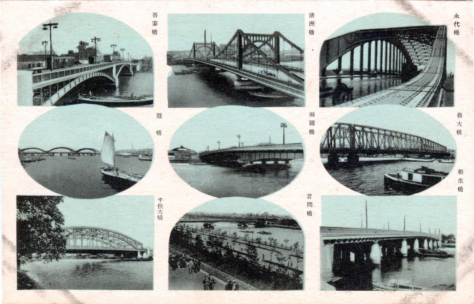 Top row: Azuma-bashi (1931), Kiyosu-bashi (1928), Eitai-bashi (1924).