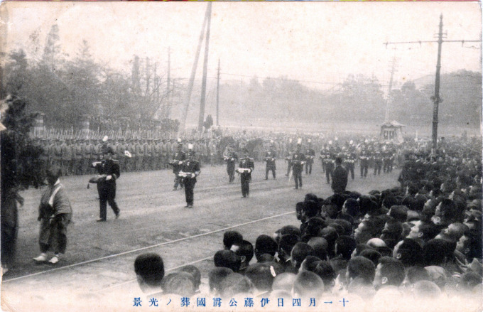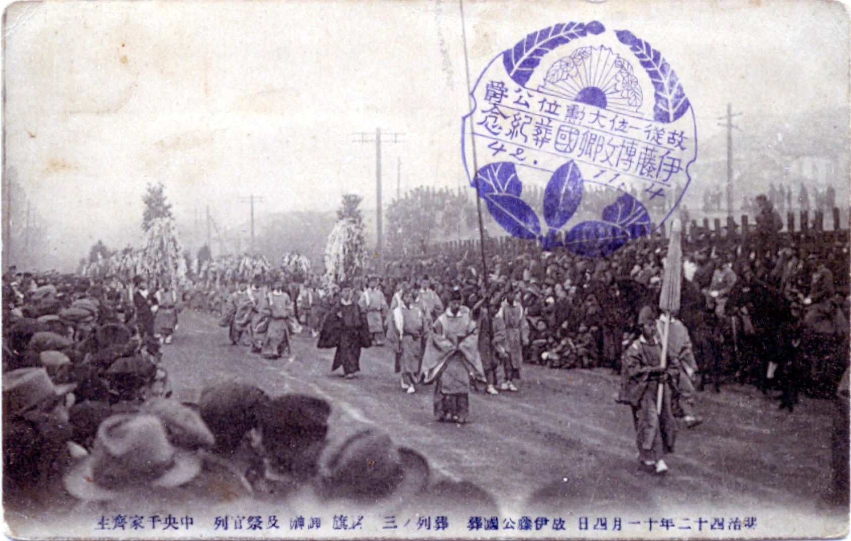 Prince Ito Hirobumi’s funeral procession, Nov. 4, 1909. Ito was revered in Japan as father of the first constitution and its parliamentary democracy. But, he was despised in Korea as the personification of Japan’s colonial imperialism of the Korean peninsula in Ito’s role as the colony’s first administrator-general. Ito was assassinated at Harbin, Manchuria, by a Korean nationalist patriot, An Chung-gun, on Oct. 26, 1909. Between 1963-1989, an engraving of Ito would appear on the ¥1000 note.