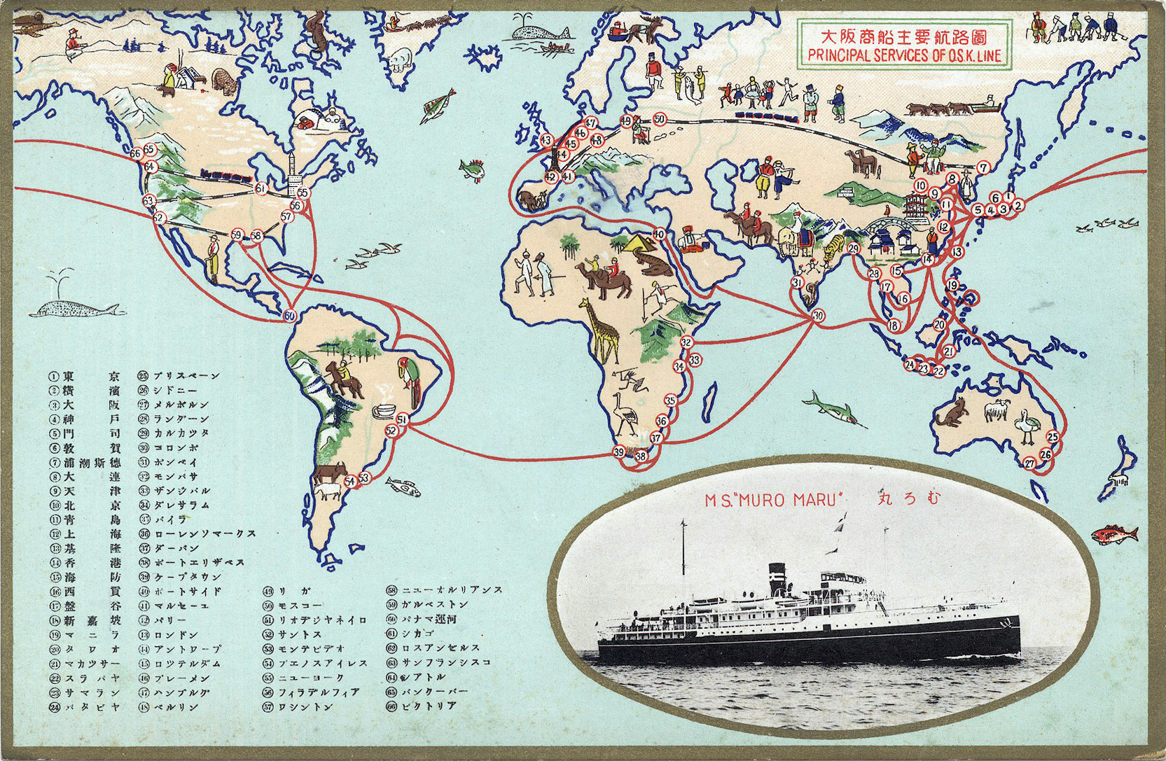 “Principal services of O.S.K. Line”, c. 1930, illustrating the passenger-cargo shipping company’s principal ports-of-call around the world. Pictured is the the M.S. Muro Maru, laid down in June 1926 and built by Mitsubishi Ship Building and Engineering, K. K. as a 1,600-gross ton passenger-cargo ship, launched at Kobe on 9 December 1926, and entering service between Japan and the China coast in February 1927. In 1938, the vessel was requisitioned by the Imperial Japanese Navy for use, first, as a “special transport ship” and, then, as a hospital ship stationed primarily around Rabaul, Truk, Saipan and the Marshall Islands. Muro Maru was inadvertently sunk outside of Manila harbor in November 1944 by US carrier planes.