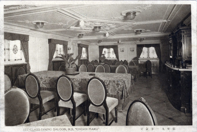 “1st Class Dining Saloon, M.S. Choan Maru“, O.S.K. Lines, c. 1930. The Choan Maru serviced O.S.K.’s Kobe-Tianjin (China) route from 1927 until requisitioned by the Imperial Japanese Navy in November 1941.