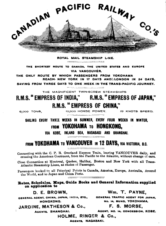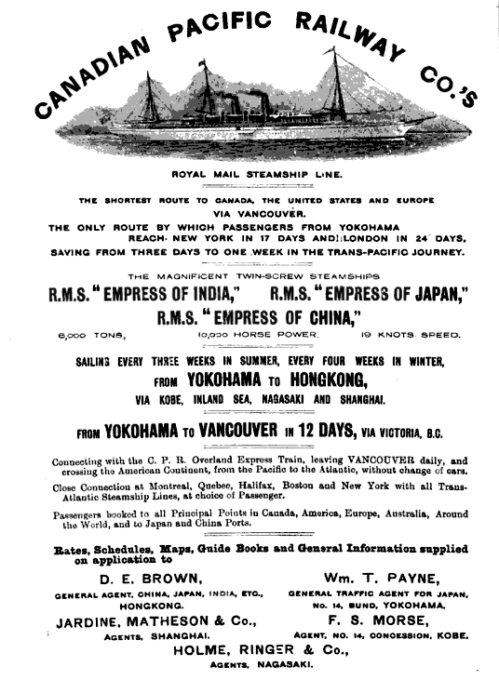 “In 1889, the Canadian Pacific Railway signed a ten year transpacific mail contract with the British government. That contract called for Canadian Pacific to deliver mail from Halifax to Vancouver by rail, and then to Japan and China by ship, reaching Hong Kong in 684 hours from April to November and 732 hours the rest of the year.