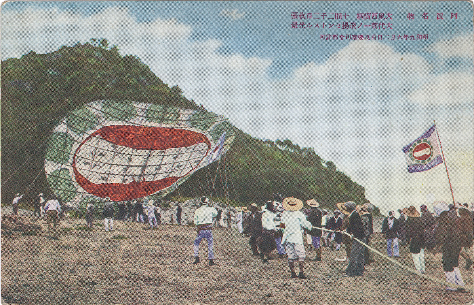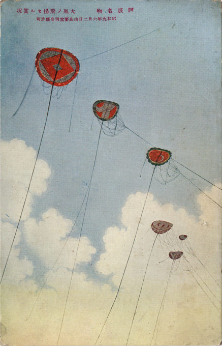 Round kite (wanwan-dako) flying at Naruto, Shikoku, 1935. The giant, round wanwan-dako of Shikoku’s Tokushima Prefecture are well-known as some of the largest kites made in the world. These commemorative postcards depicting the flights of these giant kites are dated June 2, 1935 (Showa 9).