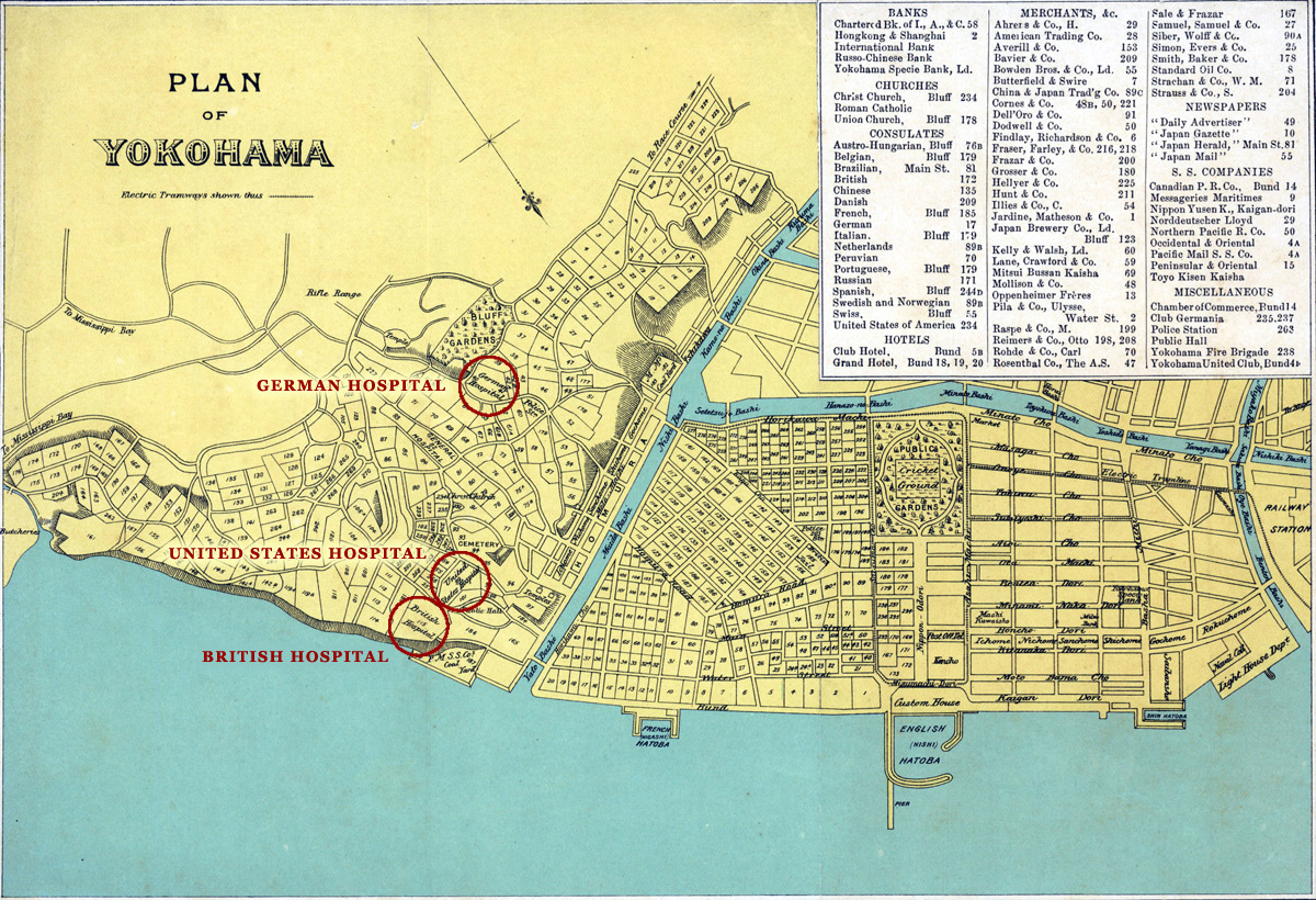 Locations of foreign hospitals on the Bluff, Yokohama, c. 1907. That the three were identified by distinct nationalities had less to do with restricting medical treatment than it had to do with their beginnings as hospitals begun originally to treat their respective merchant sailors, of whom there were a great many more docking at Yokohama over the course of any year than the combined population of foreigners residing in the port city.