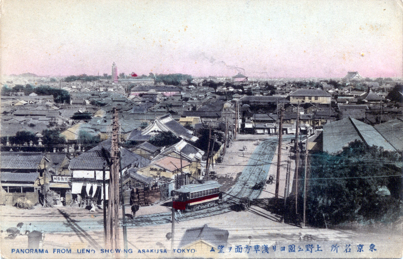 Ryounkaku (Twelve-Storeys Tower), left of center, the tallest structure in Japan 1890-1923, rises above Asakusa Park as seen from Ueno Station, c. 1910.