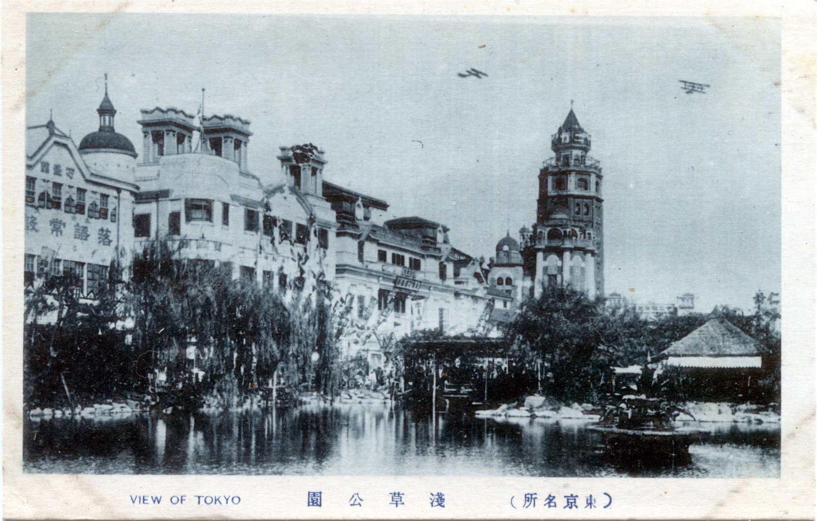 - An early biplane flies above the Ryounkaku and Asakusa Park, c. 1920.