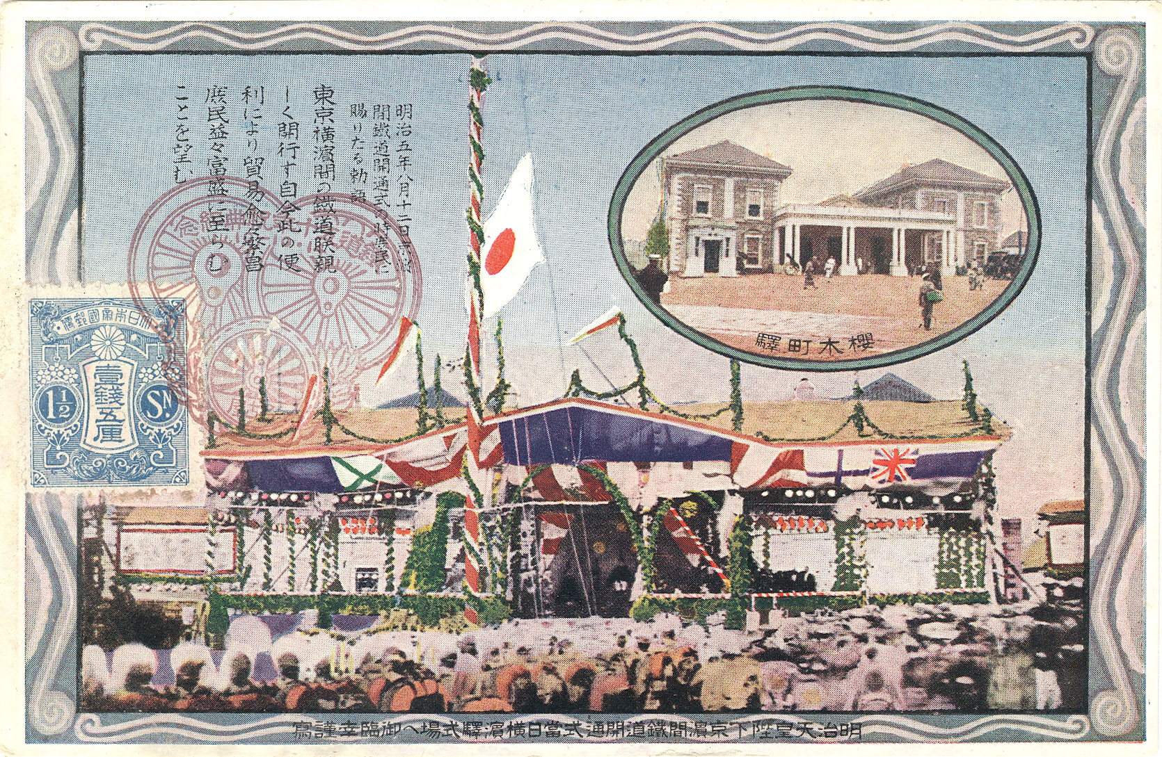 50th Anniversary of Japanese Railroads commemorative postcard, 1922. The blessing of Sakuragicho (Yokohama) Station with Shinto rites, June 12, 1872.