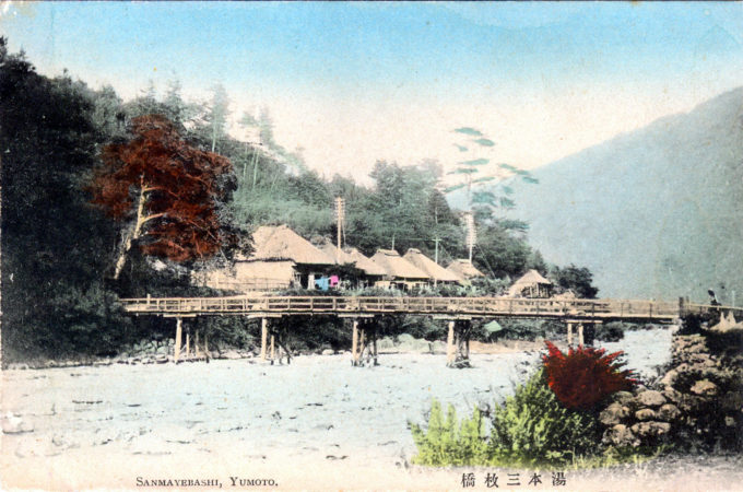 “… Yumoto is practically the beginning of Hakone. It is a cluster of hotels and shops which have gathered around some hot springs which give their name to the place. The hotels are good, the baths are delightful, the scenery around you is beautiful. Two streams united their waters at Yumoto, and two valleys lead you into the heart of the mountains.