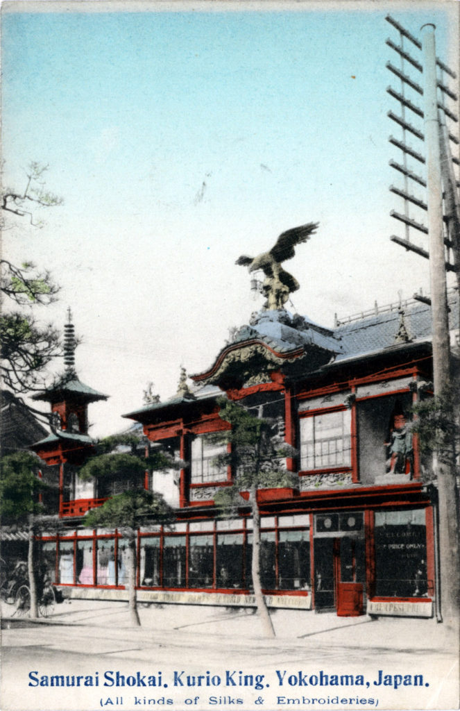 Samurai Shokai, Yokohama, c. 1930. Yokohama’s famous art curio shop, Samurai Shokai, was opened in 1894 by Nomura Yozo, the self-proclaimed “Kurio King”, who had apprenticed in the art curio business at a New York City Asian art gallery, A.A. Valentine. In its first six months, Nomura’s shop sold some 10,000 objects. Over time, purchases from Samurai Shokai would become important objects d’art of art collections at the Honolulu Academy of Art and the Sackler/Freer Museum in Washington, D.C.