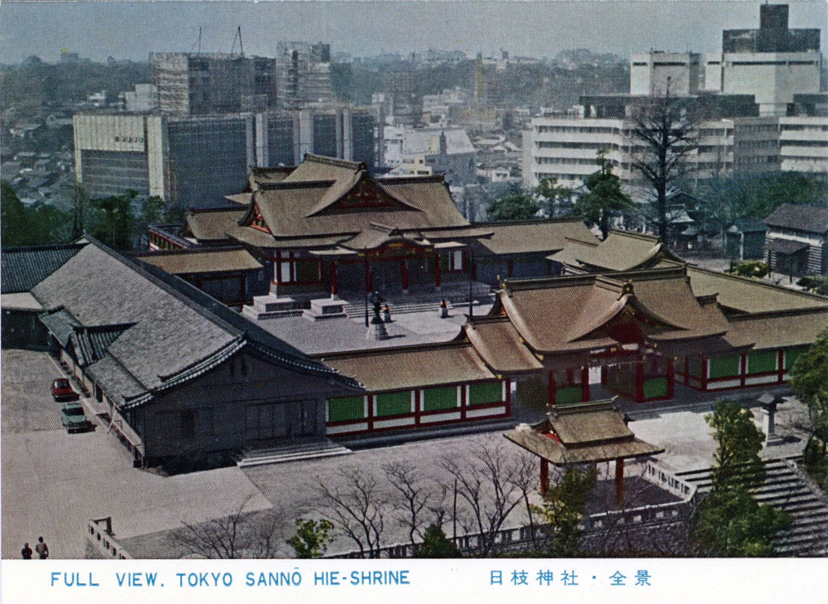 “Full View, Sannō Hie Shrine”, Nagatacho, Tokyo, c. 1960, surrounded by a city still reemerging from wartime destruction into postwar prosperity. Much of the main shrine structure was destroyed during the Tokyo firebombings (1945), and was rebuilt in the years after the Pacific War. During the period of State Shintoism lasting from 1871-1945, Hie Shrine was designated among the first-rank of government-supported shrines — which totaled only sixty-seven shrines nationwide, but including nearby Meiji Shrine. Within the shrine premises is the Sanno Inari Jinja, sporting 90 vermillion torii gates that wind up a staircase leading from the street.