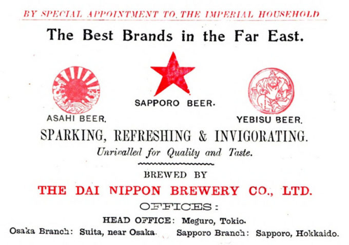 “In 1906, the amalgamation of the Sapporo Beer Co. into the Nippon Beer Co. (Tokyo) and the Osaka Beer Co. resulted in the formation of the Dai Nippon Beer Brewery. The three signature beers continuing to be produced are Yebisu, Sapporo and Asahi.”