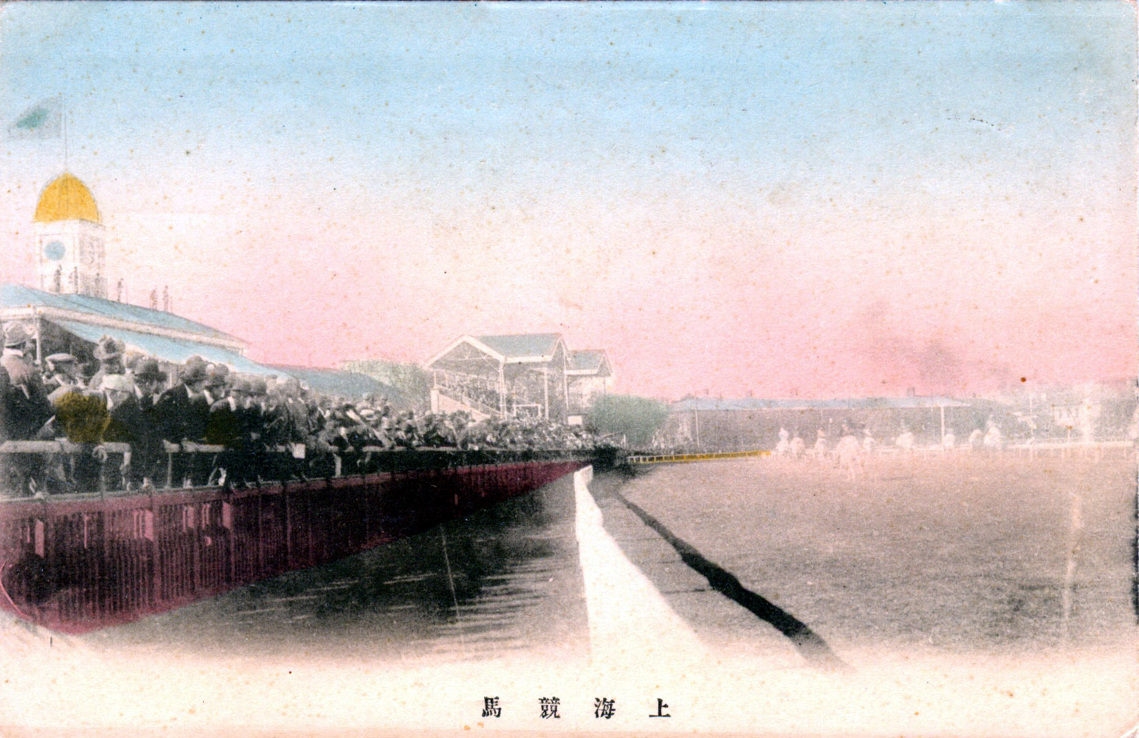 Horse race, Shanghai Race Course, Shanghai, China, c. 1910 postcard published in Japan. As one of the colonial overseers of the Chinese “open city”, Japan enjoyed the same extraterritorial rights and privileges as did Great Britain, France and the U.S. This was the third incarnation of the race track, first opened in 1862, located in the heart of Shanghai.