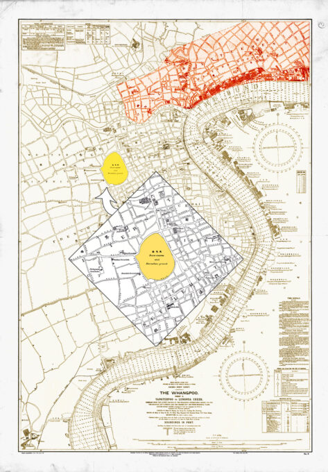 Map: Shanghai, China, 1937. The Shanghai Race Club race track is highlighted in yellow; the Japanese-administered section of the city is highlighted in red. [Base map source: David Rumsey Collection.]