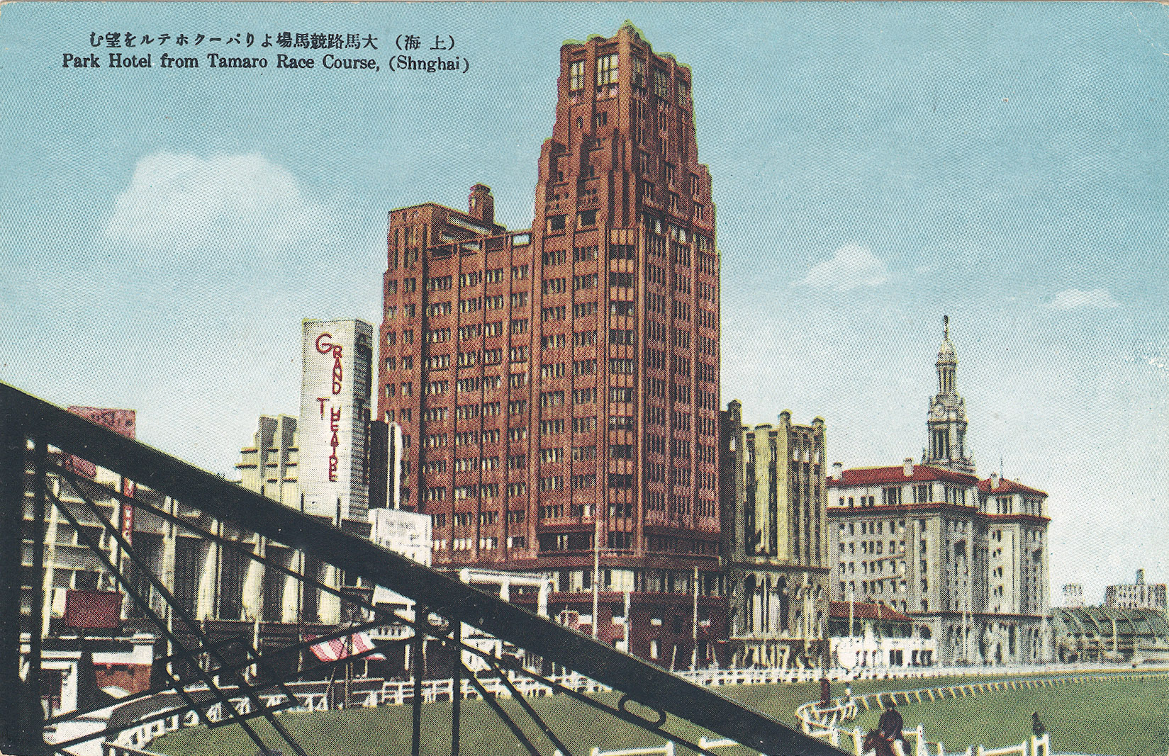 Shanghai Race Course, Shanghai, China, c. 1935. The rebuilt race track and nearby Park Hotel. A new race course was constructed 1933-34, with a new grandstand (said at the time to be the largest in the world) and new out-buildings replacing the 70+ years old originals. The new Art Deco-inspired administration building remains today from that period as a museum.
