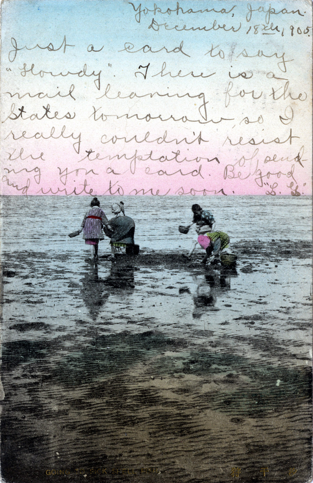 “[I]n May, when the fall of the spring tide bares long stretches of beach at Shinagawa, a scene of picturesque animation is presented by gaily dressed maidens and youths delving for shell fish in ankle-deep water.”