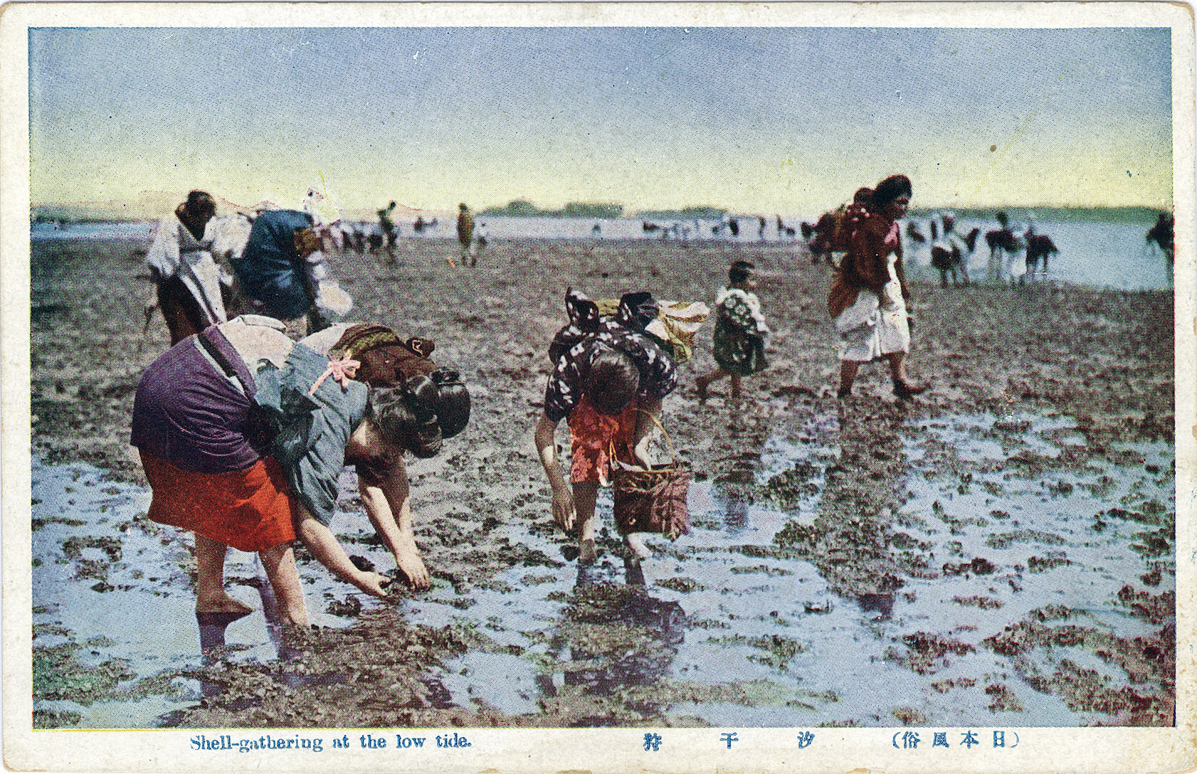 “Bare-footed or wearing rubber boots, with trousers rolled and kimonos turned up at the knee, the people, flushed with enthusiasm, bend down over the muddy beds, digging here and poking there to gather shell-fish.