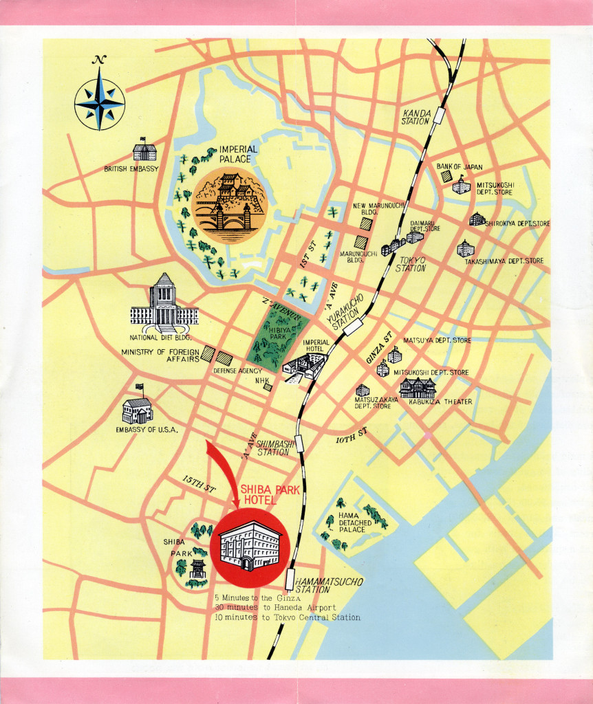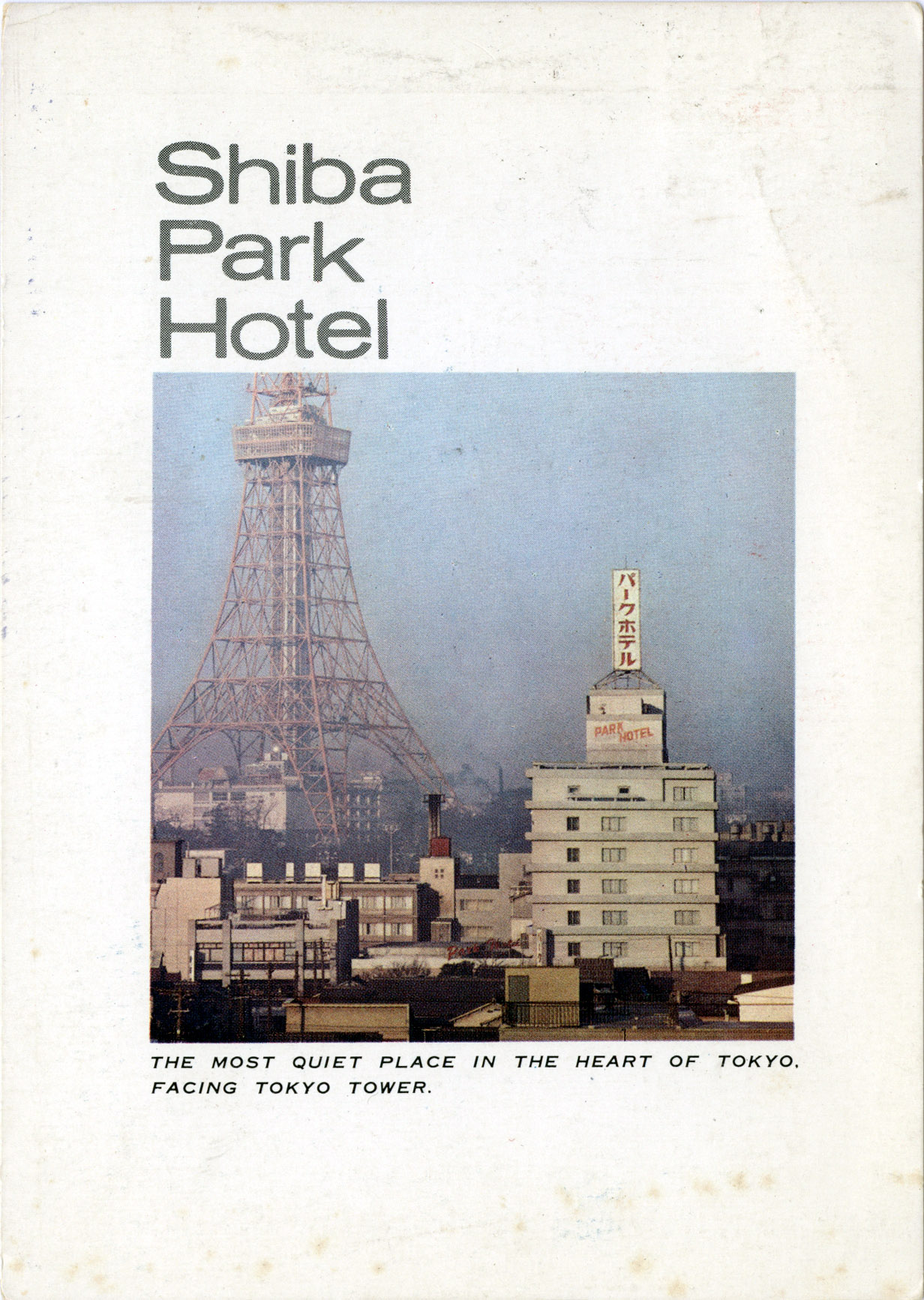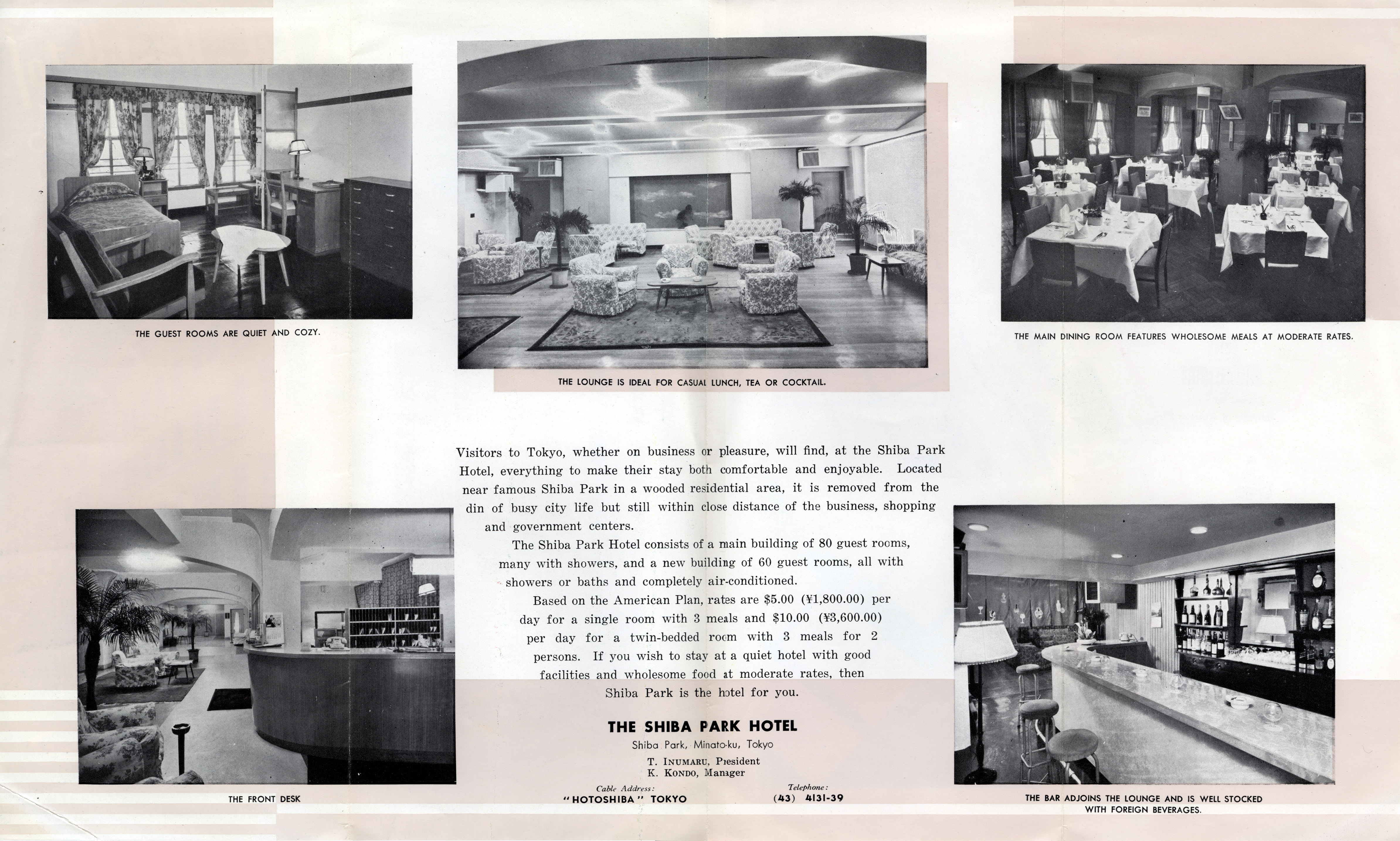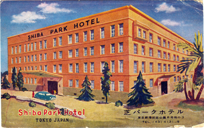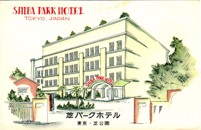 “The forerunner of the Shiba Park Hotel was the women’s dormitory of the adjoining Kyoritsu Pharmaceutical University (presently, Kyoritsu Campus of the Keiyo Gijuku University Pharmacology Department). After the war, it became an officers’ lodge assimilated in GHQ (General Headquarters of the US Army). Subsequently, under the management of the Ministry of Trade, it became a hotel for overseas trade missions.