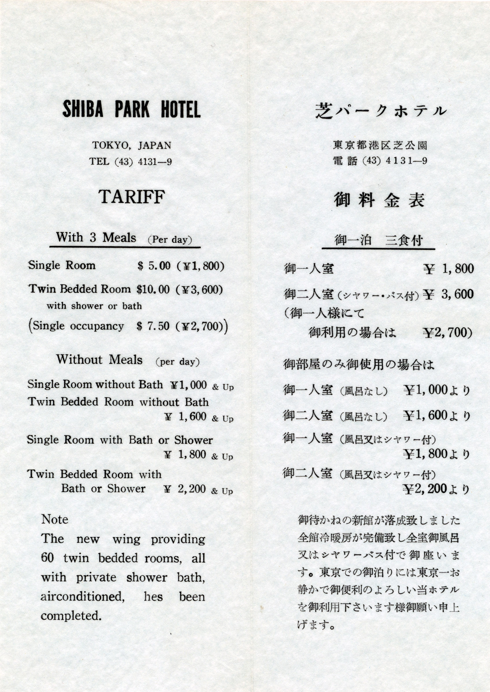 “In 1949, it came under private management, and the present Shiba Park Hotel was born. The director of this small, 77-room hotel, Tetsuzo Inumaru, was also the director of the Imperial Hotel, which is the most famous hotel in Japan. In 1956, the hotel sold the ‘American Plan’ offering one night stays for $5 with 2 meals included and in 1960, with the opening of a Chinese restaurant under the direct management of the hotel, the ‘Peking Mansion’ (currently, ‘Peking’), it introduced a new wave into the Japanese hotel industry.