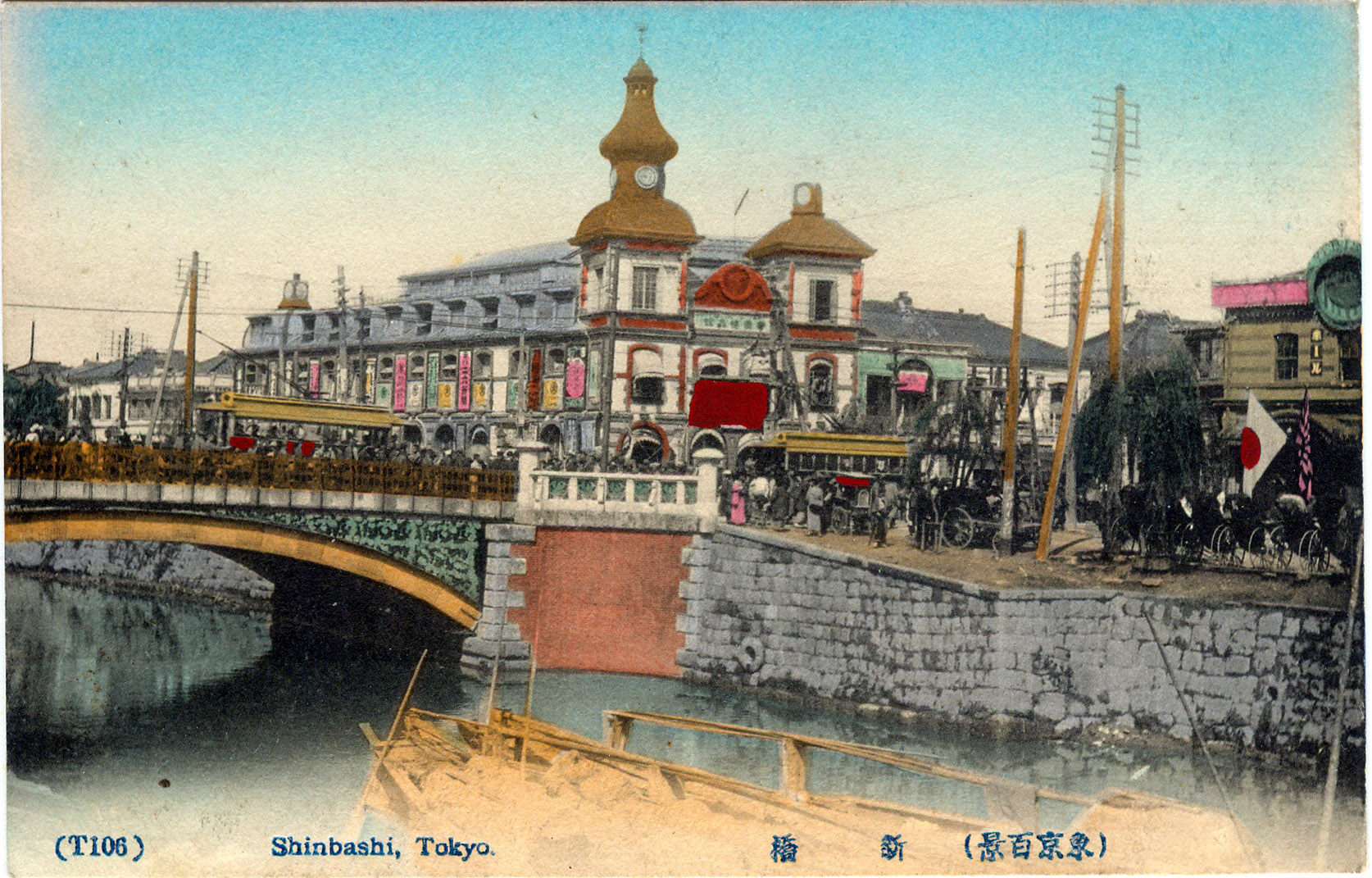 Shimbashi Bridge, c. 1910, erected in 1899. Across from which is Hakuhinkan, first opened in 1899 and now the largest toy store in Japan.