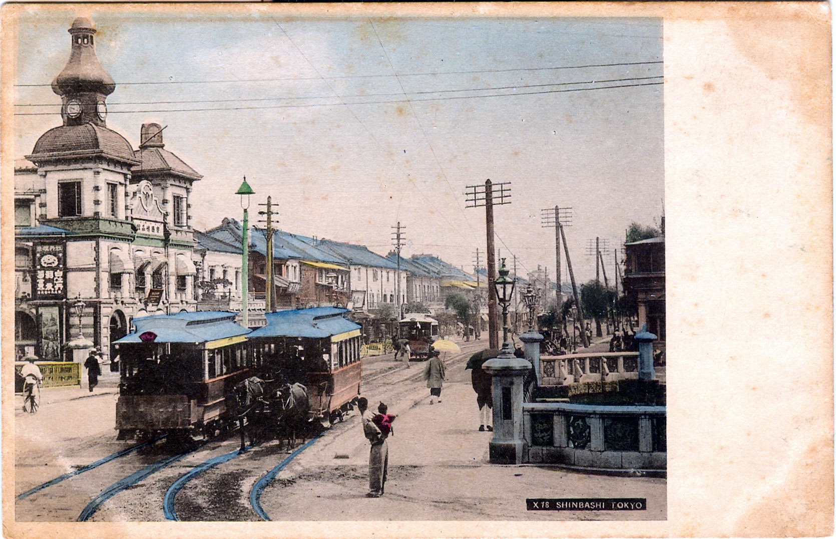 - Electric streetcar glides across Shimbashi, c. 1905. Routes #1 (Shinagawa-to-Ueno via Shimbashi & Ginza) was the first streetcar routes electrified.