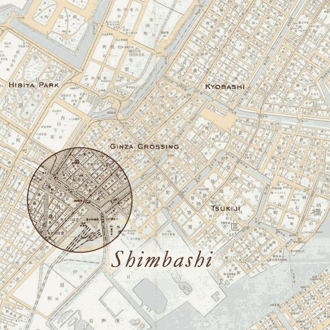 Shimbashi’s location also made the district a natural base for manufacturing and commercial innovation during the Meiji period. Among the first Japanese manufacturing companies founded at Shimbashi was Tanaka Seizo-cho [Tanaka Engineering Works, Co.], by Tanaka Hisashige (the “Thomas Edision of Japan”), in 1874, to build Japan’s first telegraphic equipment. His company would later merge with nearby Kyobashi-based Tokyo Denki [Tokyo Electric Co.] to form Toshiba in 1939.