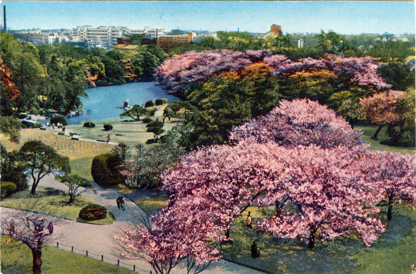 Shinjuku Gyoen (Garden), c. 1960. While the National Garden hosts only half the number of cherry trees which give Ueno Park its spring splendor, Shinjuku Gyoen’s one-thousand cherry trees are still a marvel to view given that the garden rests in the very shadow of the bustling Shinjuku sub-city, mere minutes walking-distance away.